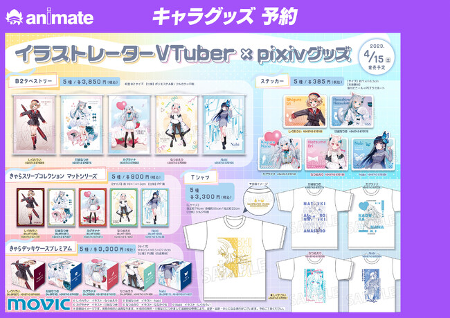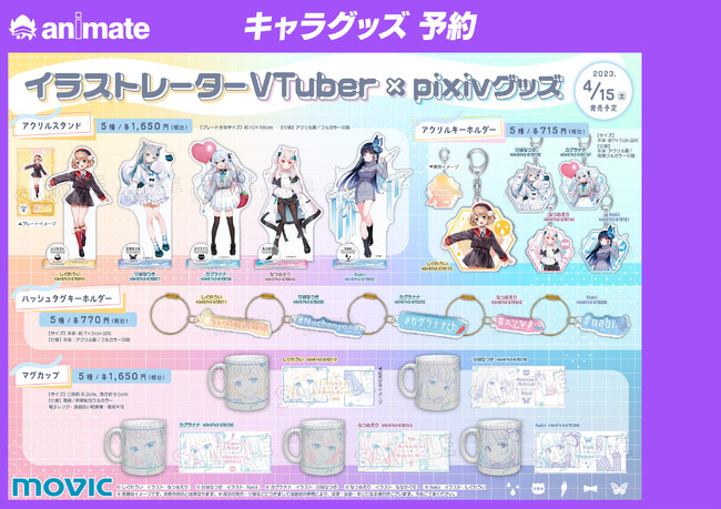 ピクシブ株式会社(本社:東京都渋谷区、代表取締役:國枝信吾、以下ピクシブ)は、株式会社ムービック(本社:東京都豊島区、代表取締役:高橋竜、以下ムービック)と連携し、VTuberやV Singerとしても活躍する人気イラストレーター「しぐれうい」「甘城なつき」「ななかぐら」「なつめえり」「Nabi」のコラボレーションイラストグッズを2023年4月15日(土)より発売します。