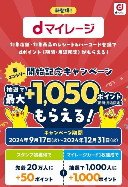本サービスの提供開始を記念して、「dマイレージ開始記念キャンペーン」(以下、本キャンペーン)を、2024年9月17日(火)から2024年12月31日(火)まで開催します。