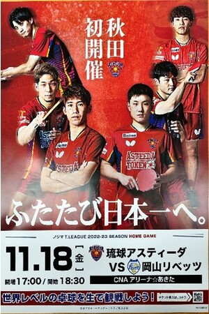 秋田県内で初の開催となる卓球Tリーグ2022-2023シーズン、琉球アスティーダは岡山リベッツと対戦します。琉球アスティーダには、「チョレイ!」のかけ声でお馴染みの張本智和選手、対戦相手の岡山リベッツには、控えめなガッツポーズでクールなファンタジスタ丹羽孝希選手が所属。東京2020大会で活躍したメダリストによる世界トップレベルのプレーを秋田で観戦できるとても貴重な機会となっています。