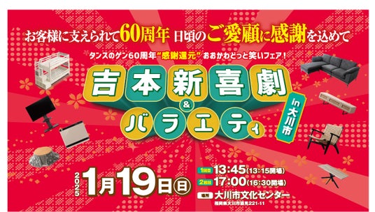 家具・インテリアのEC事業を展開するタンスのゲン株式会社(以下、タンスのゲン、本社:福岡県大川市、代表取締役:橋爪裕和)は、創業60周年を記念した地域感謝のイベントとして、2025年1月19日(日)に『タンスのゲン60周年“感謝還元”おおかわどっと笑いフェア“吉本新喜劇&バラエティ”』(以下、本公演)を開催と、抽選で2000名様を本公演に無料でご招待することをお知らせします。