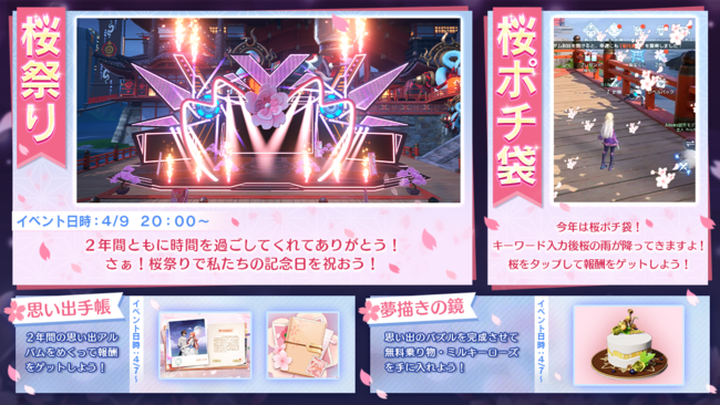 さらに2周年当日(明日4月9日)20時から、ゲーム内で「桜祭り」が開催された後には、公式生放送で新しい主題歌の公開予定です! ぜひ生放送をご覧ください! 豪華報酬もゲットできますよ~!