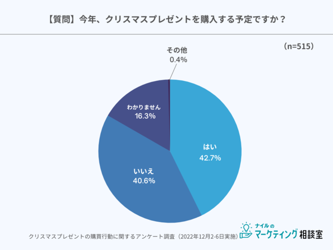 今年クリスマスプレゼントを購入すると回答した人は42.7%、しないと回答した人は40.6%でした。