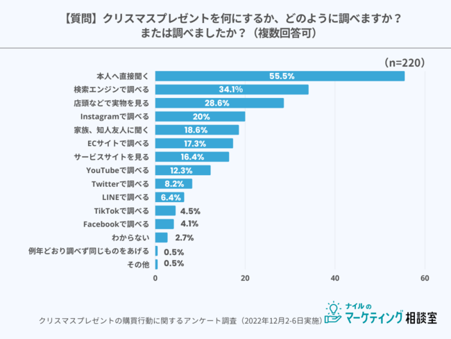 クリスマスプレゼントを何にするか、調べ方を聞きました。半数以上の人が「本人に直接聞く(55.5%)」と回答。次いで、「検索エンジンで調べる(34.1%)」、「店頭などで実物を見る(28.6%)」と回答しました。