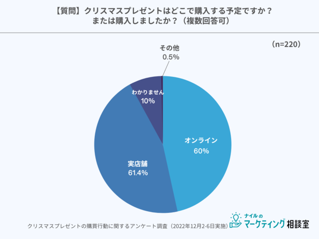 クリスマスプレゼントの購入場所は「実店舗」と「オンライン」ほぼ同数