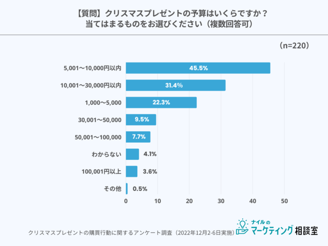 クリスマスプレゼントの予算「5,001~10,000円(税込)」が最多
