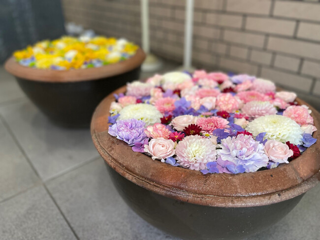 (注)花手水とは、参拝前に手や口を清めるために設けられた神社の手水舎(ちょうずしゃ)や睡蓮鉢に、色とりどりの花を浮かべたもの。今回は、睡蓮鉢を用いた花手水を展示します。
