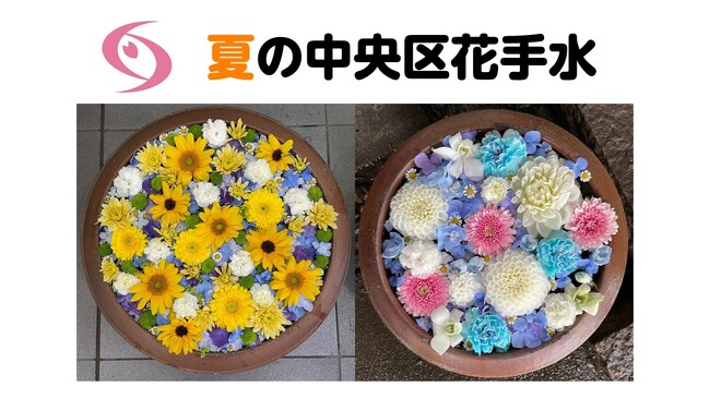 今回は夏の風物詩であるひまわりや、中央区のシンボルマークカラー(さくら色×白など)を基調とした花手水を展示します。