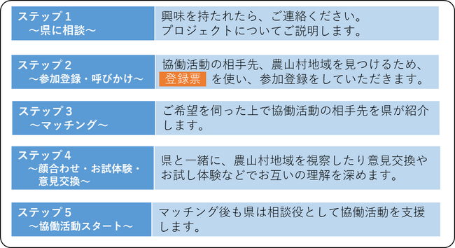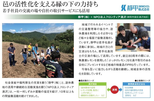 静岡県では、農山村地域の課題可決に向けて、地域と企業が対等関係でパートナーシップを組み、双方にメリットのある協働活動の実現を目指し、マッチングを行います。