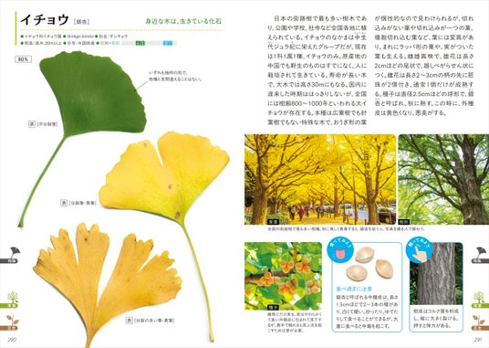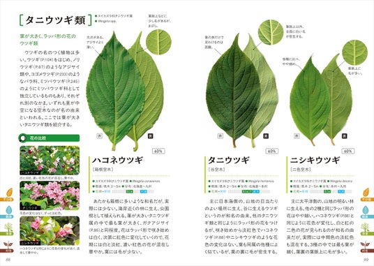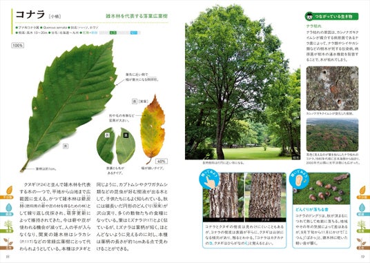 写真を増量・充実のコラム・ワイドな紙面で、より見やすくリニューアルしました!持ち運びに便利なハンディサイズで、葉っぱの写真を手がかりに樹木を検索できます。