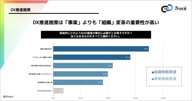 -DX推進では、中途人材の採用やリスキリングが最も注力されている取り組みである