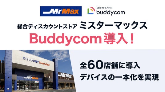 株式会社サイエンスアーツ(所在地:東京都渋谷区、代表取締役社長:平岡竜太朗、以下「サイエンスアーツ」)は、株式会社ミスターマックス(所在地:福岡県福岡市、代表取締役社長:佐藤昭彦、以下「ミスターマックス」)の全店60店舗(2026年4月7日時点)において、フロントラインワーカーをつなげるライブコミュニケーションプラットフォーム「Buddycom(バディコム)」が導入されたことをお知らせします。
