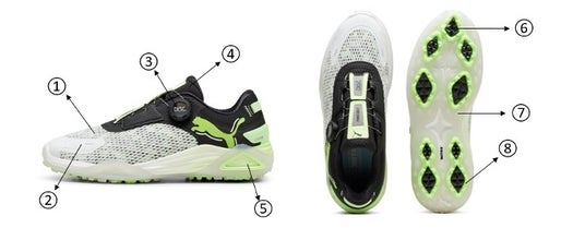 アウトソールはプーマのロゴであるピューマからインスピレーションを受けた猫の目の形をしたCAT-EYE TRACTION(キャットアイ トラクション)が特徴的です。スイング時の体重移動を考慮して配置されたCAT-EYE TRACTION(キャットアイ トラクション)中心部がより硬度のある樹脂となり、外側は柔軟性のある樹脂を使用することで、強力に地面をグリップします。