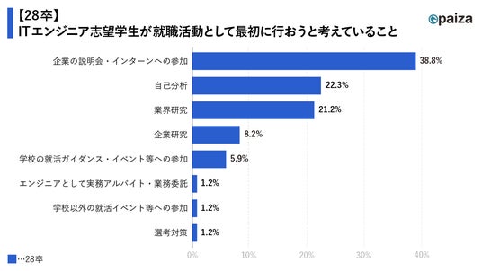 28卒学生が「就活でまず最初に行おうと思っていること」を調査したところ、「企業の説明会・インターンへの参加(38.8%)」が、自己分析や適性検査対策を抑えて最多となりました。