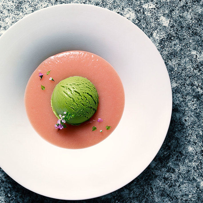 抹茶の旨味を引き立てるため、抹茶アイスクリームの中に加えた黒蜜ソースは香りが良く上品な甘さに仕立てました。