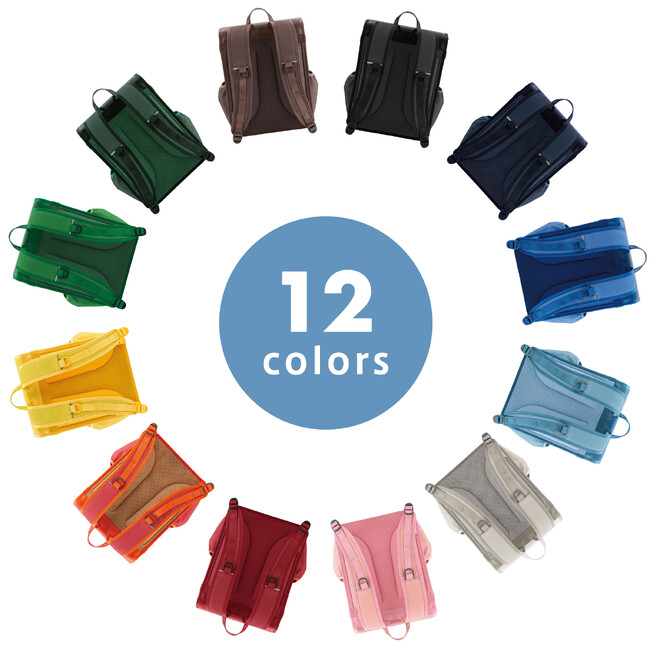 1.ランドセルの重量化による子どもの体への負担軽減のため、ナイロン素材と人工皮革を融合し軽量化を実現。 2.ジェンダーレスな提案として、男女問わず好きな色を選べるような12色の豊富なカラー展開。
