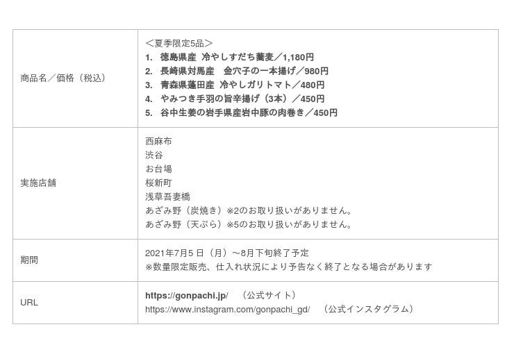株式会社グローバルダイニングは、「権八」にて、夏季限定5品を、2021年7月5日(月)より、提供開始いたします。https://gonpachi.jp/
