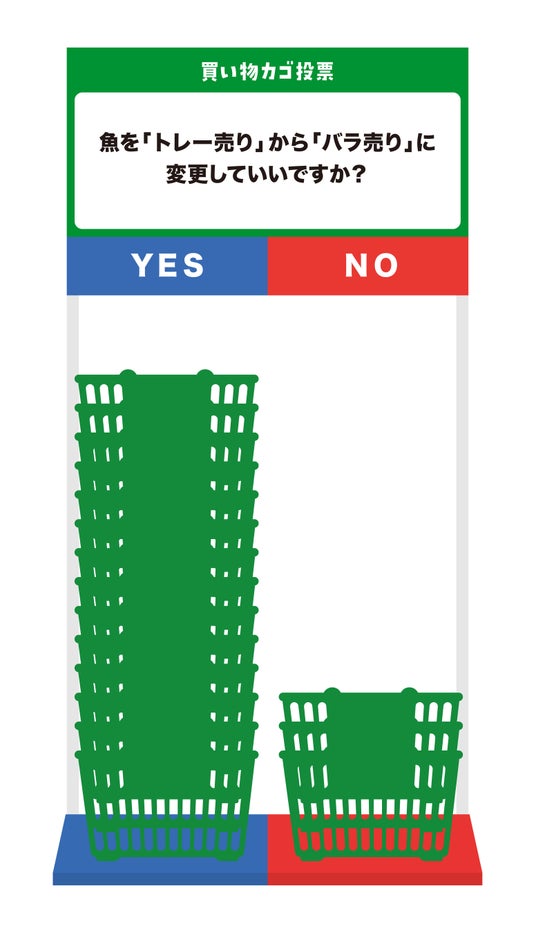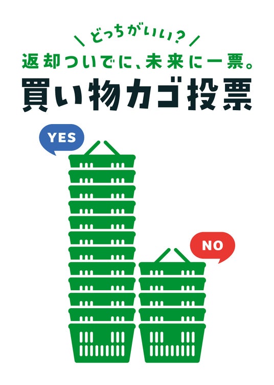 「買い物カゴ投票」は、スーパーからの二者択一の設問に対して、消費者が買い物かごを返却する際に、「YES」か「NO」のかご置き場にかごを返却することで回答が行なえる仕組みです。買い物かごを返却するだけで投票ができる仕掛けは、スーパーからの問いに、消費者が簡単に意思表示でき、その声を受けてスーパーが取り組みを進めることができる新たなコミュニケーションの形です。