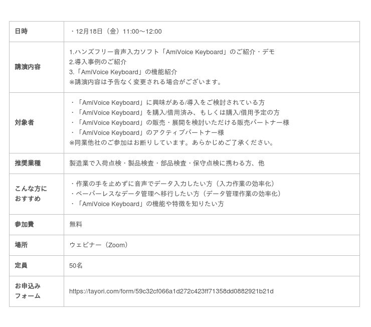 株式会社アドバンスト・メディア(本社:東京都豊島区、代表取締役会長兼社長:鈴木清幸 以下、アドバンスト・メディア)は、6月より開催しご好評いただいている製造業向け事例紹介 / 製品紹介セミナーを12月も開催いたします。