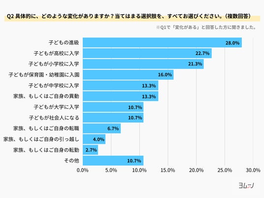 また、家族、もしくはご自身の「異動」(13.3%)や「転職」(6.7%)、「引っ越し」(4.0%)、「転勤」(2.7%)といった仕事や住環境の変化も一定数見られました。
