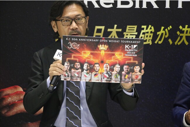 9月2日(土)都内にて、「ReBOOT~K-1 ReBIRTH~」〔9月10日(日)神奈川・横浜アリーナ〕のK-1 30周年記念無差別級トーナメントの対戦カードをK-1のカルロス菊田プロデューサーが以下のように発表した。