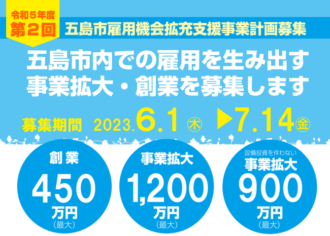 長崎県五島市は、市内での雇用創出につながる事業拡大や起業に要する経費の4分の3(最大1,200万円)を補助する事業を全国から公募します。