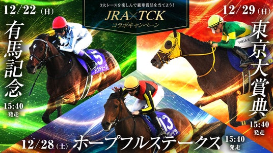 ■有馬記念×ホープフルステークス×東京大賞典コラボキャンペーンJRA の一年を締めくくるグランプリレース「12/22 有馬記念(GI)」と 2 歳馬の中距離チャンピオン決定戦「12/28 ホープフルステークス(GI)」、そしてTCK で行われるダート競馬の総決算「12/29 東京大賞典(GI)」。3 つの GIレースに関するクイズや予想を楽しみながら、10万円分のJCBギフトカードなど豪華賞品が当たる「有馬記念×ホープフルステークス×東京大賞典コラボキャンペーン」を実施します。