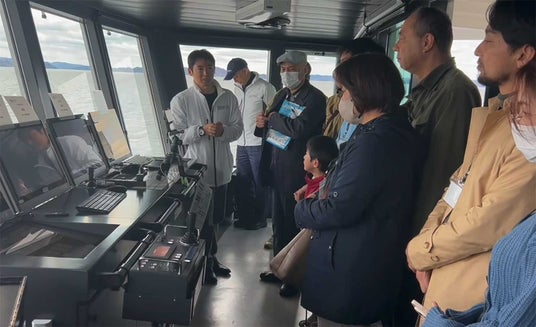 自動運航船「おりんぴあどりーむせと」受容性向上プログラムにおけるブリッジ見学の様子
