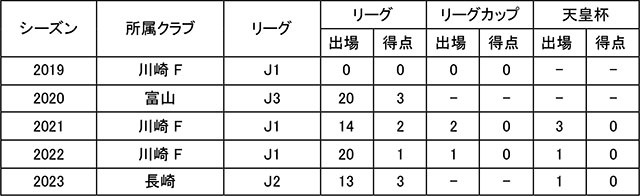 所属歴/川崎フロンターレU-12 - 川崎フロンターレU-15 - 川崎フロンターレU-18 - 川崎フロンターレ - カターレ富山(期限付き移籍) - 川崎フロンターレ - V・ファーレン長崎(期限付き移籍)