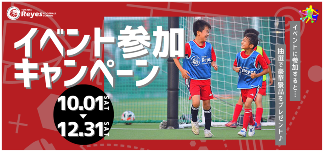 各スクールにて実施するイベントと秋と冬に実施予定のキャンプへ参加した方を対象とした『イベント参加キャンペーン』を実施いたします。イベント参加者の中から抽選でノベルティをプレゼントいたしますので、ぜひご参加ください。皆様のご参加をお待ちしております。 ※当キャンペーンは蹴祭対象キャンペーンです。