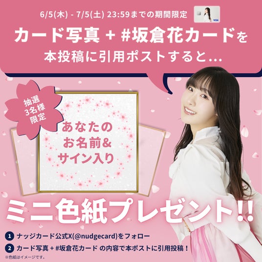 ナッジカード公式Xのキャンペーン投稿に「坂倉花 公式クレジットカード」の写真とハッシュタグ “#坂倉花カード” を付けて引用リポストした方の中から抽選で3名様に「宛名&サイン入りミニ色紙」をプレゼント。詳細はナッジカード公式Xをご確認ください。