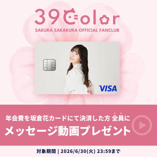 坂倉花Official Fanclub「39Color」の年会費のお支払いで「坂倉花公式VISAカード」をご利用いただいた方全員に「限定メッセージ動画」をプレゼントいたします。