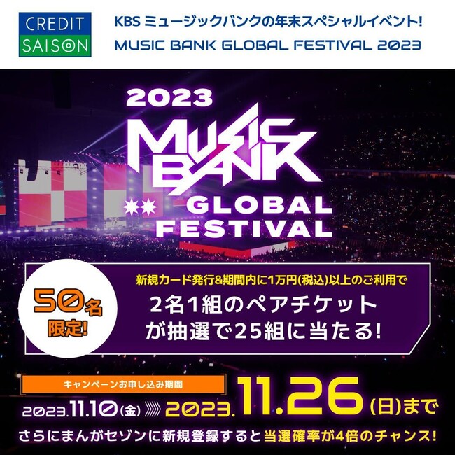 株式会社クレディセゾン(本社:東京都豊島区、代表取締役(兼)社長執行役員COO:水野 克己、 以下:当社)は11月10日(金)から11月26日(日)までの期間中に、クレジットカード「SAISON CARD Digital」をお申込みいただき、発行されたカードで1万円(税込)以上ご利用いただいた方の中から抽選で25組50名様に、人気イベント「MUSIC BANK GLOBAL FESTIVAL 2023」のペアチケットがあたるキャンペーンを開催いたします。