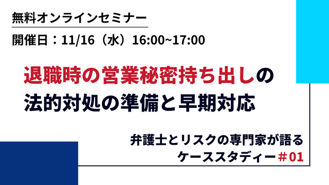 企業が抱えるデジタルリスクを予兆・検知・解決するソリューションを手掛ける株式会社エルテス(本社:東京都千代田区、代表取締役:菅原貴弘、証券コード:3967、以下「エルテス」)は、株式会社東京海上日動パートナーズTOKIO、弁護士法人ALG&Associatesと、2022年11月16日に共催セミナーを開催いたします。本セミナーは、退職時の情報持ち出しリスクに対して、弁護士とリスクの専門家が具体的なケーススタディーを通じて、法的対処の準備と早期対応の方法について解説いたします。