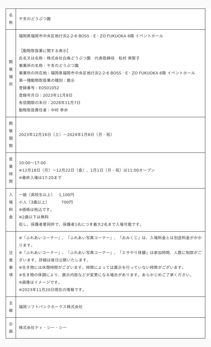 十二支の動物たちがE・ZOにやってくる!12月16日(土)~2024年1月8日(月・祝)の期間限定で、見て!さわって!楽しめる!「干支のどうぶつ園」をBOSS E・ZO FUKUOKA 6階イベントホールにて開催決定!チケットは好評販売中。