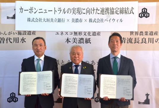 日本全国47都道府県のカーボンニュートラル実現を目指す株式会社バイウィル(本社:東京都中央区、代表取締役社長:下村 雄一郎、以下「バイウィル」)は、岐阜県美濃市(市長:武藤鉄弘、以下「美濃市」)、株式会社大垣共立銀行(本店:岐阜県大垣市、取締役頭取:林 敬治、以下「大垣共立銀行」)と、「カーボンニュートラルの実現に向けた連携協定」を締結しました。