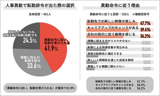 回答者全体の461人に人事異動で転勤辞令が出た際の選択を聞くと、「異動命令に従い、転勤を受け入れる派」が41.9%で最多となり、「現職に残るが、転勤を断る派」が33.6%、「転勤したくないため、転職(退職)する派」が24.5%となりました。異動命令に従うと回答した193人にその理由を聞くと、「転勤先での新しい刺激が楽しみ」が47.7%で最多となり、次いで「キャリアアップのチャンスがある」が39.4%、「会社の指示に従う義務を感じる」が34.2%となりました。