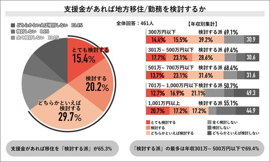 回答者全体の461人に支援金があれば地方移住/勤務を検討するかと聞くと、「検討する派」が65.3%で、内訳は「とても検討する」15.4%、「検討する」20.2%、「どちらかといえば検討する」29.7%でした。「検討する派」の年収別では、「301万円~500万円以下」が69.4%で最多となり、次いで「300万円以下」が69.1%、「501万~700万円以下」が68.4%、「1,001万円以上」が55.1%、「701万~1,000万円以下」が50.7%となりました。