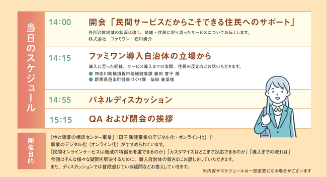 昨年秋に初めて開催した「ファミワンカンファレンス」、今回は初めて自治体の皆様向けに、「民間サービスに委託できるオンライン支援とは」をテーマに、ファミワンを導入している自治体さまの声から学ぶ場として、事例紹介とパネルディスカッションなどを行います。