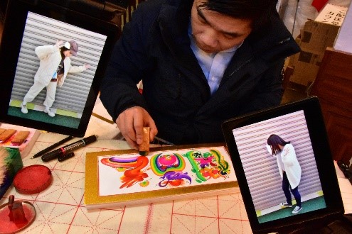 花文字の作品は、モニターの位置や、花文字の書き進むタイミングも計りながら、何枚も撮り続けました。