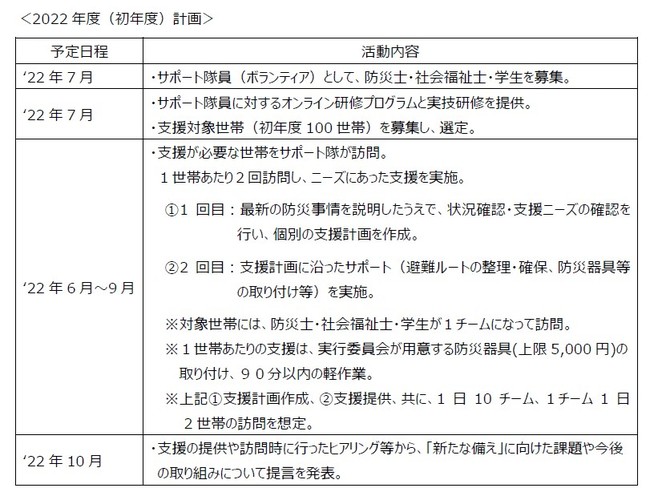 初年度として、高齢者等支援が必要な100 世帯の防災に対する備えをサポートします。