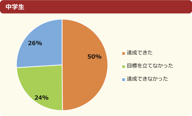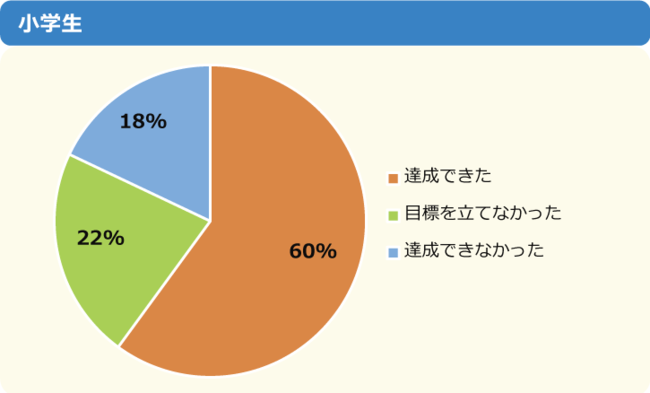 約6割の子どもたちが2022年の目標を達成できているようですが、中学生は達成できた人が半数に留まっています。それに伴い、達成できなかった割合も小学生18%に対して中学生は26%と増えています。年齢が上がるにつれて、達成へのハードルが高くなる傾向にあるようです。