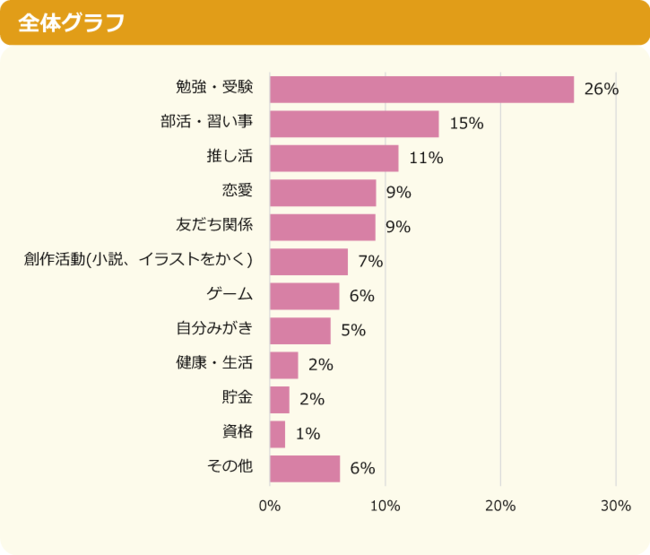 小中学生が2022年に1番頑張ったことは、「勉強・受験」で全体の26%を占めていました。次いで2位が「部活・習い事」で15%、そして3位の「推し活」と続きます。