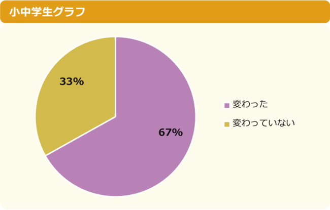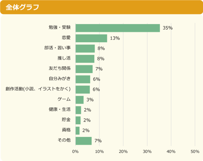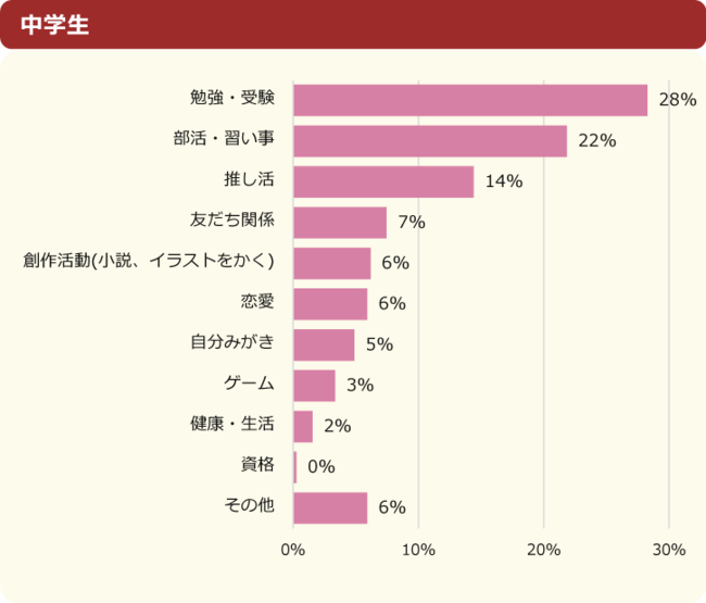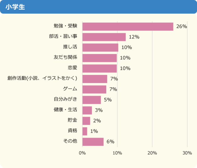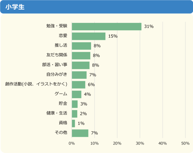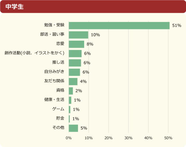 「勉強・受験」が全体の35%で1位でしたが、内訳を見ると小学生では31%、中学生では51%と割合に大きな差が出ています。2位以下の順位は小学生と中学生で異なる結果となりました。