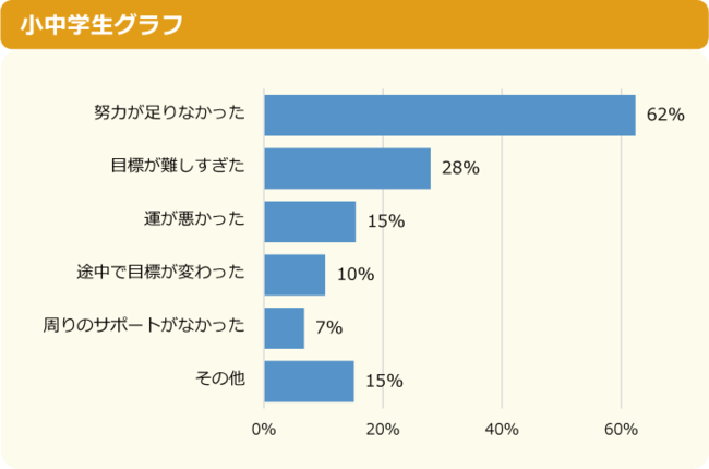 達成できなかった理由では、小中学生の62%が「努力が足りなかった」と回答しました。