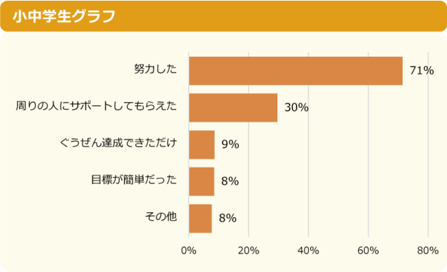 小中学生ともに、「努力した」からとの回答が71%と圧倒的に多く、続いて「周りの人にサポートしてもらえた」が2位になりました。