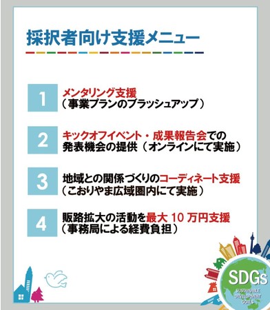こおりやま広域圏内の社会・地域課題を解決する事業アイデア・サービスを持つ起業家や国内外へ事業拡大を目指す起業家等を、こおりやま広域圏内から広く募集し、特にSDGsの達成につながる事業を公民連携でブラッシュアップし、こおりやま広域圏の地方公共団体、創業支援事業者及び起業家等のネットワークを活用しながら、事業の成長を加速させるための様々な支援を行います。