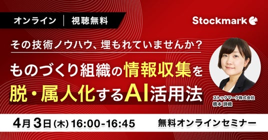 先端の自然言語処理AIを活用した情報収集サービス『Anews・Astrategy』を提供するストックマーク株式会社(以下、「当社」)はオンラインセミナー『その技術ノウハウ、埋もれていませんか? ものづくり組織の情報収集を脱・属人化するAI活用法』を4月3日(木) に開催致します。