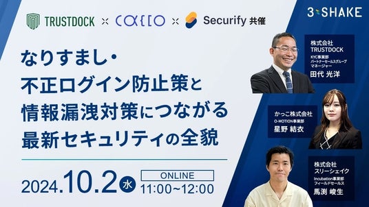 株式会社スリーシェイク(本社:東京都新宿区、代表取締役社長:吉田 拓真、以下スリーシェイク)は、株式会社TRUSTDOCK、かっこ株式会社と共同で、なりすまし・不正アクセスなどの外部攻撃から社内システムを守るための具体的な対策方法について解説する無料オンラインセミナーを、2024年10月2日(水)に開催いたします。