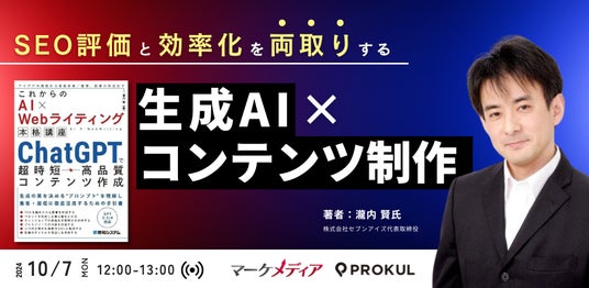 株式会社エンファクトリー(東京都千代田区、代表取締役社長CEO加藤健太、以下、弊社)は、株式会社マーケメディア( 東京都品川区、代表取締役三浦和広)とともに、2024年10月7日(月)12:00から『SEO評価と効率化を”両取り”する生成AI×コンテンツ制作 ~AI×Webライティングの融合による、SEOコンテンツ制作の方針と実際~』を開催します。