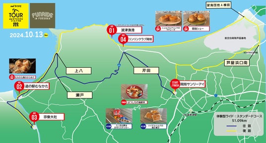 コース体験型ライドの参加者には、宗像大社をはじめ、美しい自然を堪能できるコースが設定されています。風光明媚な景色を楽しみながら、地元特産品を堪能できるエイドステーションにも立ち寄り、体力や目的に応じて選べる多様なコースが用意されています。初心者でも安心して参加できるコースから、ベテランライダー向けのチャレンジングなコースを準備しています。